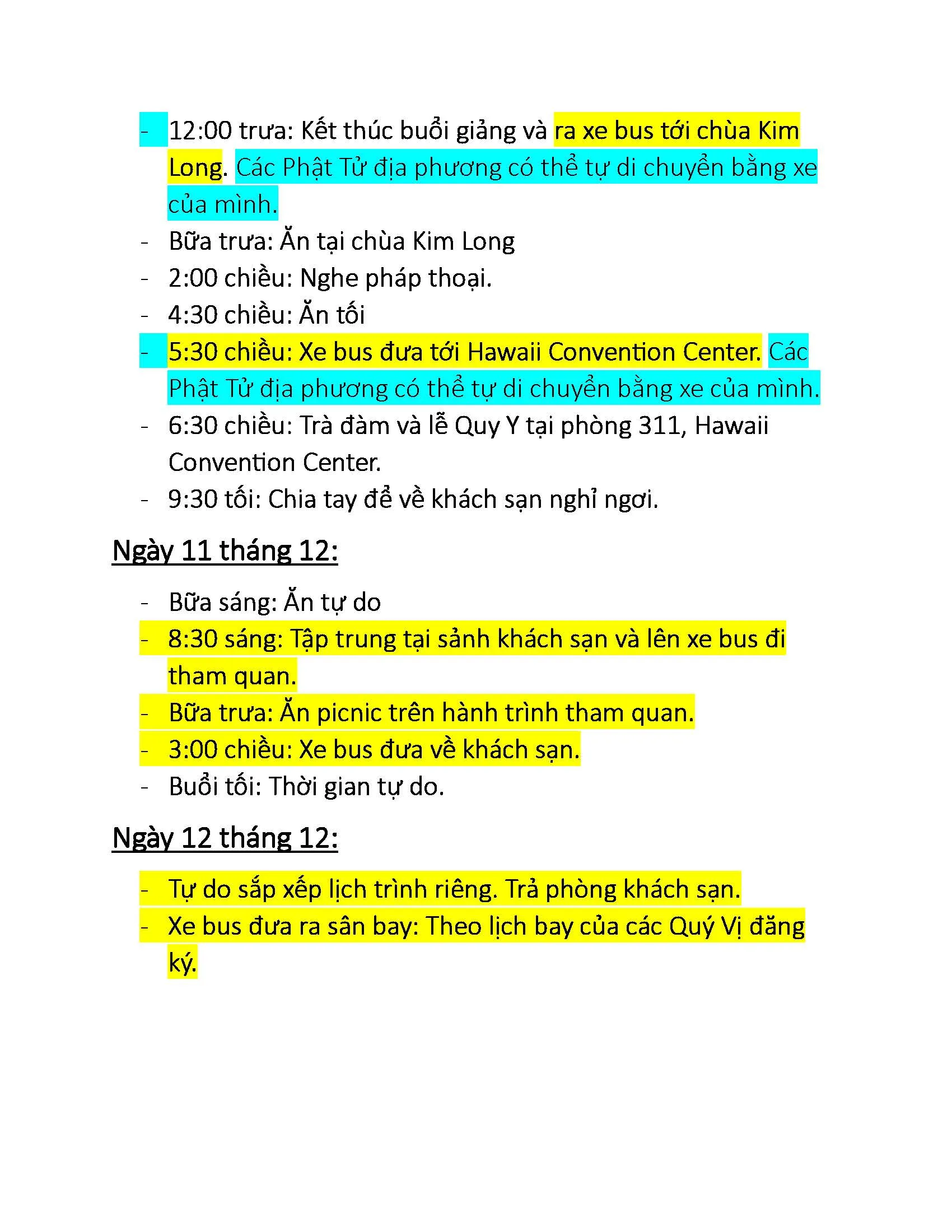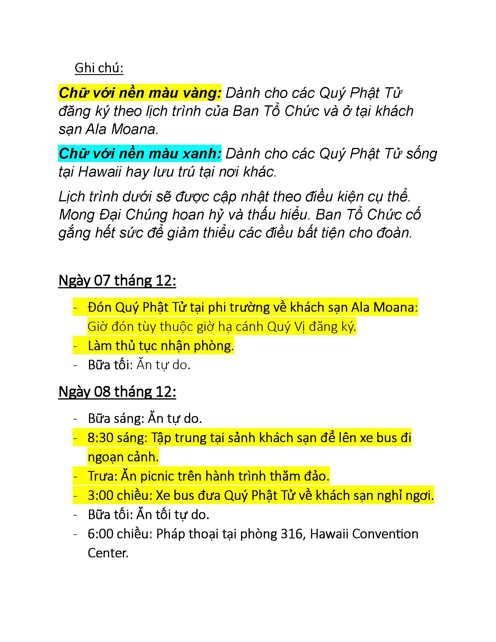 Vì quý Phật Tử bay từ các thành phố khác nhau tới Honolulu, nên xin ghi rõ tên từng người, số chuyến bay và giờ cất hạ cánh để Ban Tổ Chức tiện việc sắp xếp xe đưa đón.