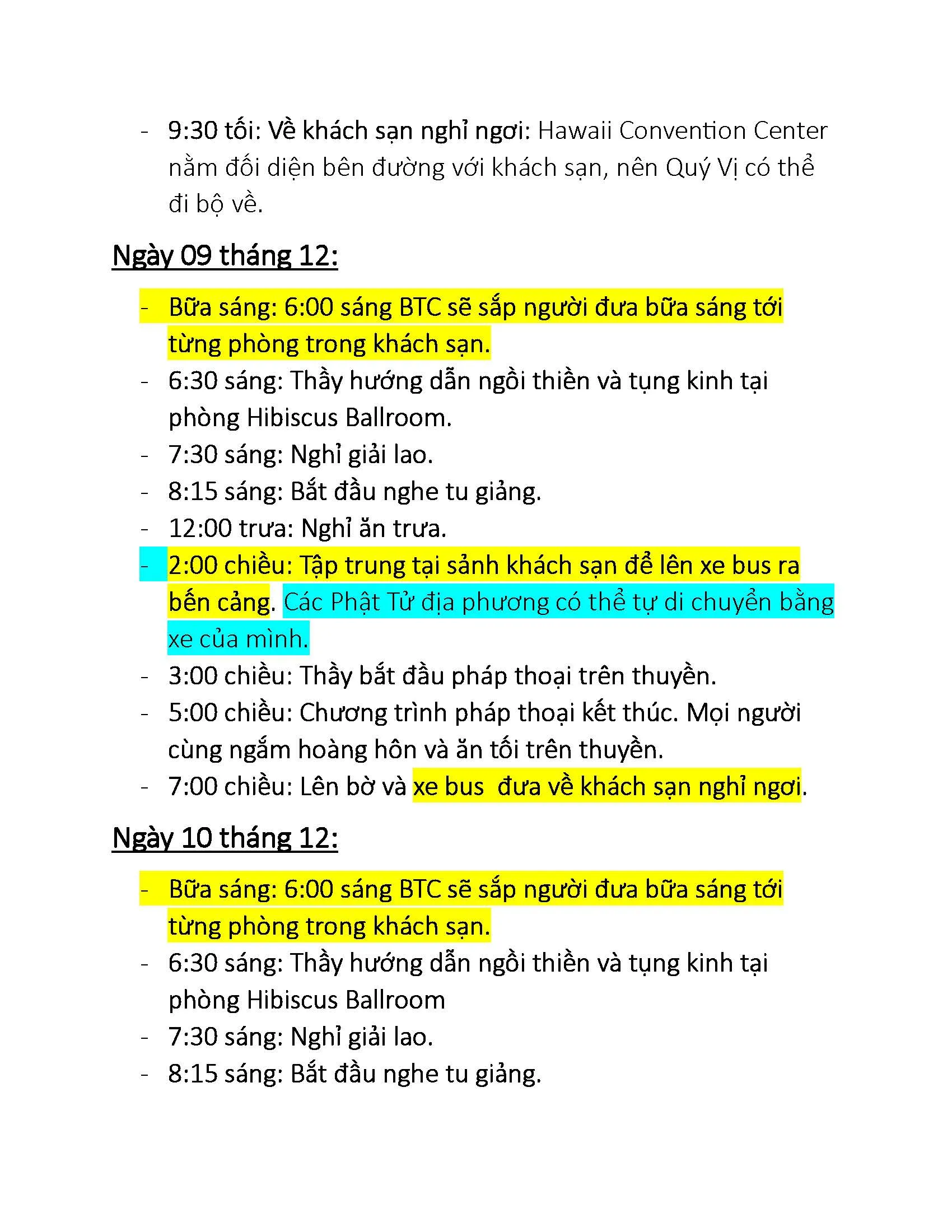 Trong thời gian ở Hawaii, đoàn sẽ di chuyển bằng xe bus. Ban Tổ Chức sẽ bố trí xe đón Đại Chúng tại phi trường vào ngày 7 rồi đưa về khách sạn Ala Moana và sẽ từ khách sạn đưa trở lại phi trường ngày 12 tháng 12.